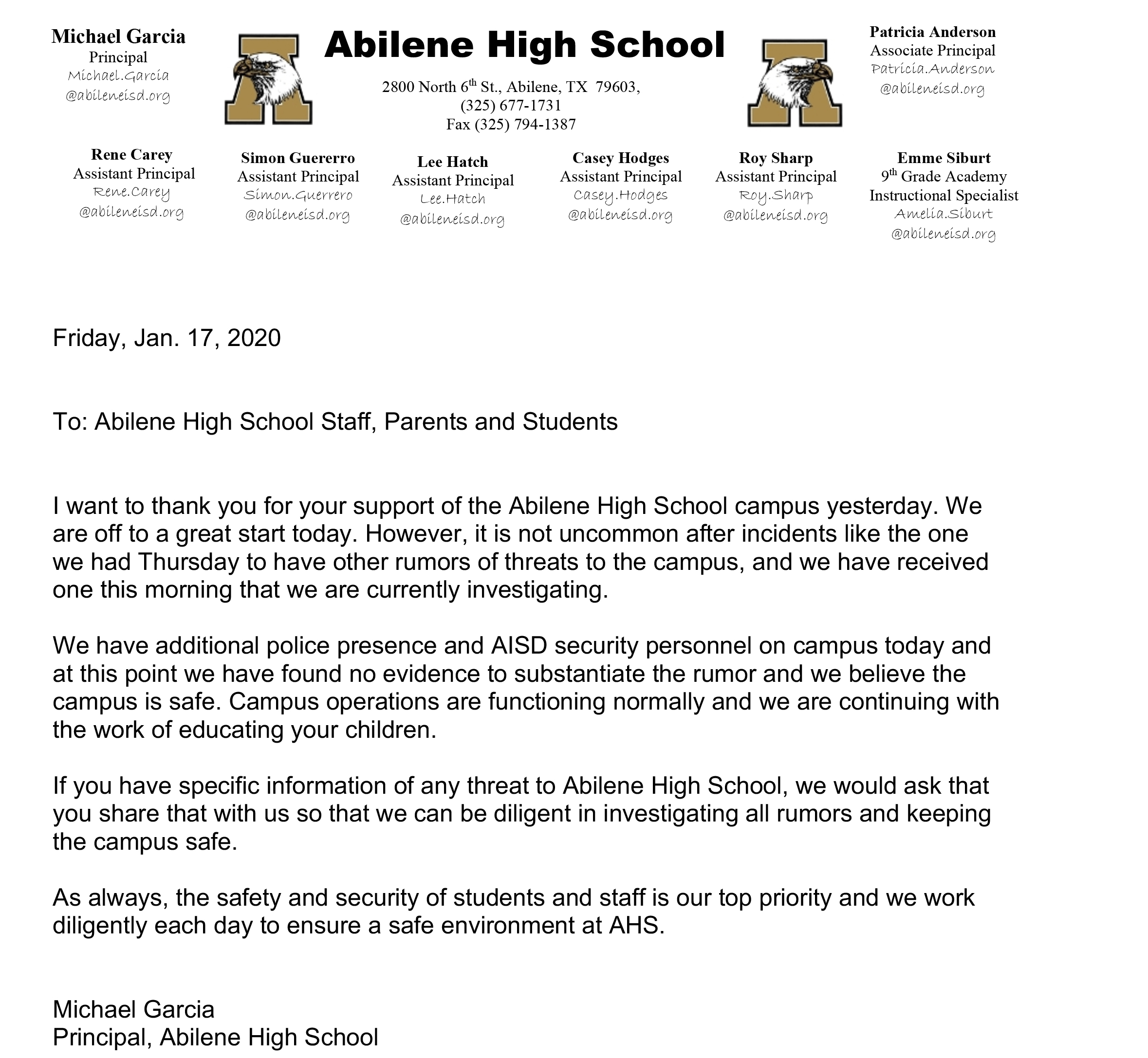 Abilene Isd On Twitter Abilene High Staff Parents And Students As Well As Others In The Aisd Please Read This Important Message Below Regarding An Unsubstantiated Rumor Of A Potential